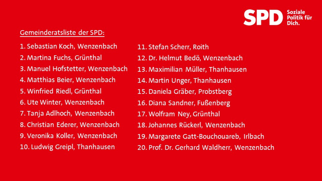 Auch die beschlossene SPD-Liste spiegelt den Zusammenhalt und die Lebendigkeit der Gemeinde wider: „Wir haben Kandidaten aus allen Ortsteilen, aus vielen Vereinen und aus verschiedenen Generationen, die ihre Heimat lieben und mit Herzblut gestalten wollen. Neben erfahrenen Gemeinderäten bringen wir junge Talente, engagierte Feuerwehrleute, Vereinsvorsitzende und absolute Verwaltungsfachleute wie Manuel Hofstetter, unseren früheren Projektleiter der Gemeinde und heutigen Amtsleiter der Stadtkämmerei in Regensburg, auf die Liste. Wir sind nicht nur eine Liste – wir sind schon jetzt ein eingeschworenes Team aus klugen, kreativen, leidenschaftlichen Köpfen - aus Menschen, die für Wenzenbach brennen.“